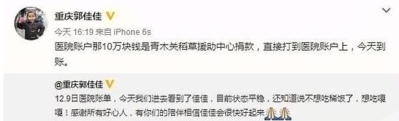 9日下午,赖荣清在个人微博“@重庆郭佳佳”上晒出了手术后缴纳的第一笔治疗费用,一共173584元整。其中10万元为银行卡缴费,73584元为沙坪坝区机关干部爱心捐款。“用以手术治疗的捐款目前佳佳账户上余额有117万,康复费暂由青木关镇政府委托机构保管。”