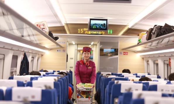 2016年12月13日,重庆,列车工作人员对食品进行销售。