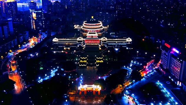 航拍夜间重庆大礼堂 堪称巴渝“夜明珠”