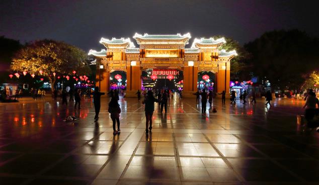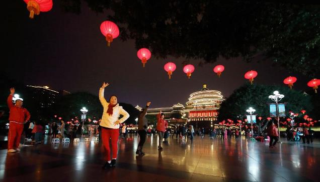 市民在重庆市大礼堂毗邻的广场上跳舞,高挂的灯笼营造出喜庆氛围。