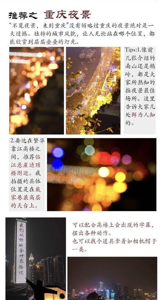 每一个地点的介绍都搭配了多张作者本人拍摄的当地图片,朝天门的棒棒、洪崖洞步行街的灯火、飞过菜园坝大桥上空的群鸟…而除了简单介绍去往每一个地方的路线以外,作者并没有过多地着墨在各个景点的吃喝玩乐上,而是列举了自己在当地拍摄照片的各种技巧。 记者在网络上搜索发现,这篇帖子最早是在2月5日就被原作者“芆君”放在了自己的微博上,随后几天被大量转发,也引起了许多网友的热议。