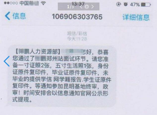 警方询问得知,梁某声称已和各航空公司的面试官打好招呼,让学生按照官网招聘信息和时间报名参加面试,结果胸有成竹的学生们都未通过面试,询问梁某,他淡定表示他能解决。学生后来的确收到了复试通知的“短信”,但根据中介经验,觉得跟公司官方发的短信形式有出入,察觉事有蹊跷,便打电话至航空公司询问,结果学生根本就没有取得终审资格。