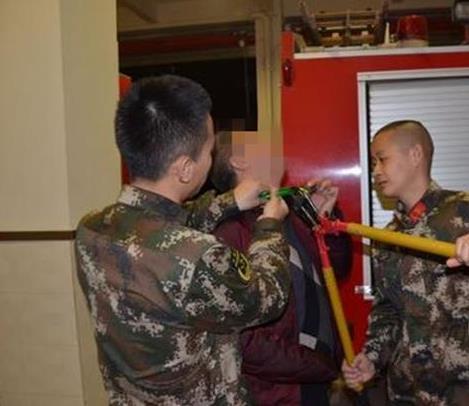2月14日晚上9点过,梁平县消防大队里来了三位愁眉苦脸的中年男子。其中一位大叔的脖子上还带着一个“紧箍咒”,苦笑着求消防官兵帮忙取下。