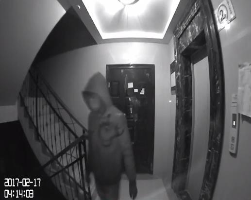 视频的上传者张先生告诉记者:这段视频是小区11栋一名业主家安装的猫眼摄像头捕捉到的画面,虽然只有短短十秒,却让小区很多业主看到后睡不着觉。监控画面显示:这个月的17号凌晨4点13分,两名男子出现在小区楼道里。这两人都身穿卫衣,头上戴着卫衣帽子,且戴着口罩,在楼道里东张西望,其中一名男子还用手拉了一下对面房门的门把手,无果后,两人顺着楼梯快速走了下去!