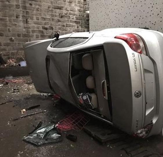 民警立即赶往现场处置。事故现场不少围观群众,为避免二次事故发生,民警用警戒带将现场隔离。据调查,事故车辆驾驶员驾驶灰色小轿车,从金山路右转往金紫街老民政局方向右转过程中,由于车速过快,车辆直接冲向了斜对面的面馆,并撞上了路边的环卫工人,之后又撞了面馆并冲下了路边大概6米左右的深沟,车头部分变形严重,并冒出少许烟,消防队快速到达现场进行处置,排除了安全隐患。事故造成两人受伤,所幸均无生命危险。