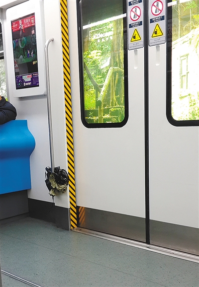 昨天午5点钟左右,杨先生从郑家院子站出发前往两路口站。由于当天在下雨,为了不让雨伞沾湿自己和他人,杨先生特地在站台上轻轻甩动了几下,然后扣起来。然而,列车行驶不久后,他无意间一抬头,发现对面车门边的扶手上居然有一把湿漉漉的折叠伞。