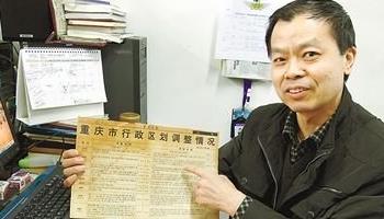 为何会更名?为何会调整行政区划?谢驰说,当时改名和调整行政区划不仅仅是渝中区。在谢驰的办公桌下压着一张报纸,那是1995年2月10日的《重庆日报》,第六版公告就是重庆市行政区划调整情况。