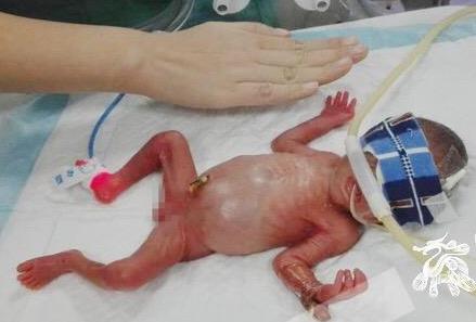 佳佳的主管医生李广红介绍,接收时,佳佳的胎龄仅25周零4天,体重550g,没有自主呼吸,全身皮肤薄如蝉翼,柔弱得不堪一击。