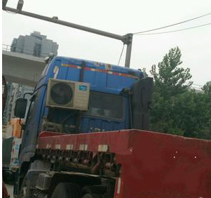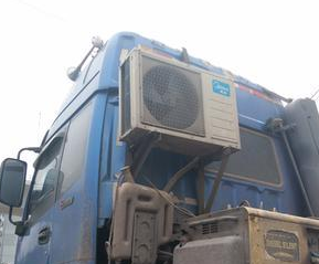 空调外机挂在驾驶室正后方,完全裸露在室外,仅用两根钢条固定。在空调外机下方摆着一台柴油发电机,还有几根电线将空调和柴油发电机连接起来。