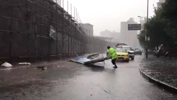 感动!他在大雨中扶起倒塌护栏