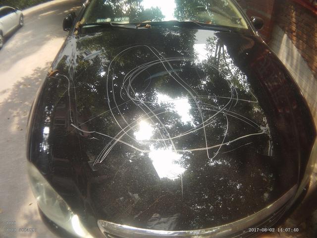 8月2日,叶女士有急事需要外出办理,往自己停车的地方走。当走到自己爱车的跟前时,被眼前的一幕惊呆了:只见车身变成一个大花脸,车的引擎盖有一个大乌龟样图案,左右两侧4个车门和车尾部及车身一圈被尖锐的东西深深地划伤,一道道深深的划痕让人有点儿心惊。可气的是,在车辆前引擎盖、左右车门还被刻上了许多个侮辱性的“SB”字样,右倒车镜也被砸坏了,更可恶的是左前车胎也被放气了。