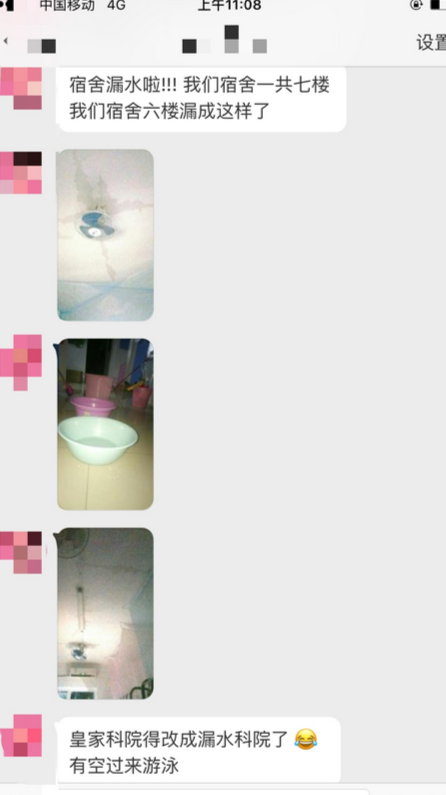 据悉,学生暑假留校,发生漏水严重漏水,地上、墙壁上都是湿漉漉的,衣柜上满是水珠。