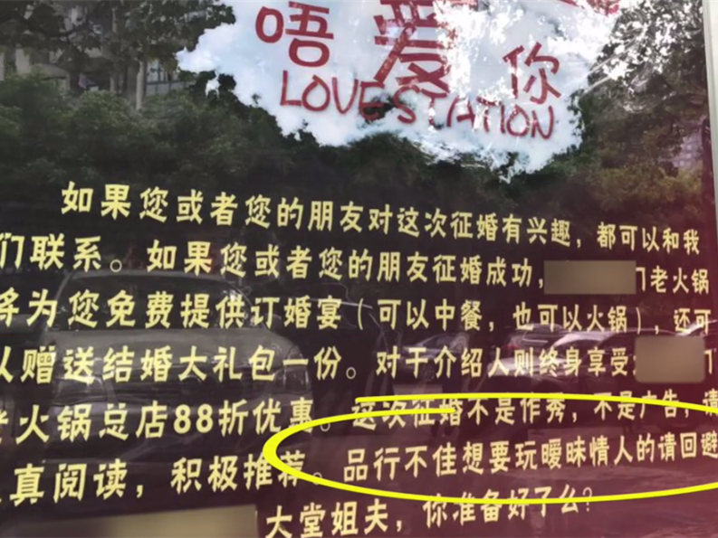 近日,重庆渝北区一家火锅店门口贴了张大海报,走近一看,原来是一张高调的征婚海报。