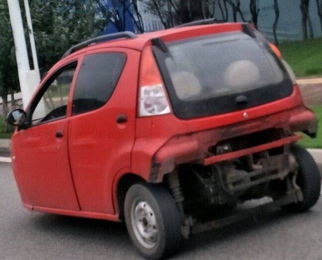 这辆红色三轮车没有车牌,车尾还残缺了一大块。
