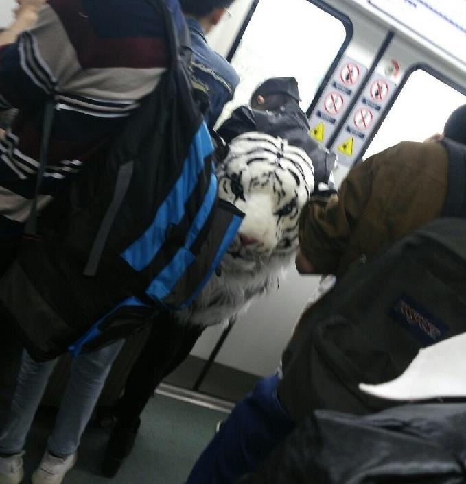 发布时间:2017-10-13 13:42:3910月13日,一则《在轻轨看到这个,都不敢靠近,就问你怕不怕?》的帖子登上重庆某论坛的首页。帖子中的照片显示:日前,有网友在轨道交通三号线乘车时,在车内发现一名休闲装扮的乘客背着的大背包是一个白虎头,站在她后面的乘客都感受着来自“老虎的凝视”。