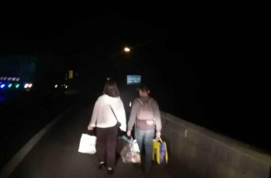 当天晚上,高速公路第三支队二大队巡逻人员巡逻至包茂高速公路出城方向1762Km处,隐约发现前方应急车道有东西在晃动,走进一看,竟然是两名提着大包小包的青年男女正在赶路,两名男女都未穿反光背心,在夜幕中很难发现,极容易发生被撞的危险,执法人员立即上前制止,将两名行人通过巡逻车带离下高速。