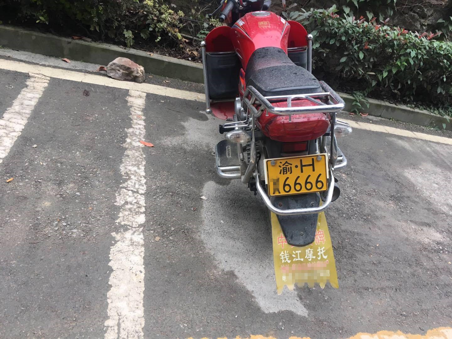 11月10日,有市民在黔江阳光花园小区看见了一个尾数为“6666”的车牌号,安安静静的套在一辆红色钱江摩托上,显得格外刺眼。