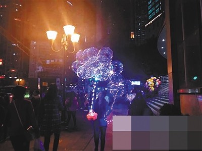 紧接着一位母亲牵着女儿过来挑选气球,经过一番讨价还价,最终这位母亲以50元两个的价格买了两个气球。她说,没办法,孩子看到这个气球就走不动了,家里还有一个孩子,如果只买一个的话,回家两个孩子容易掐架,只好买俩。她有点担心能否带上轻轨回家。