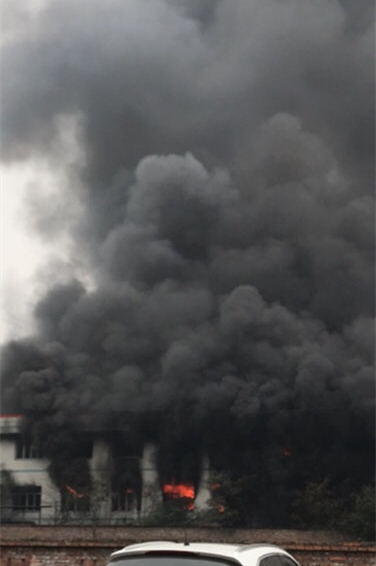 在橡胶厂门口可以看到,不断有大量黑色的浓烟从厂区冒出,源源不断地往上窜动,将整个工厂笼罩,高高腾空升起犹如“蘑菇云”,现场还有一股浓重的刺鼻气味。