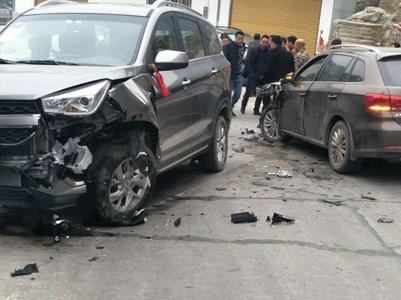 其中一辆轿车的车头损毁严重,车身还有多处凹陷,零件四处飞溅,现场一片狼藉。
