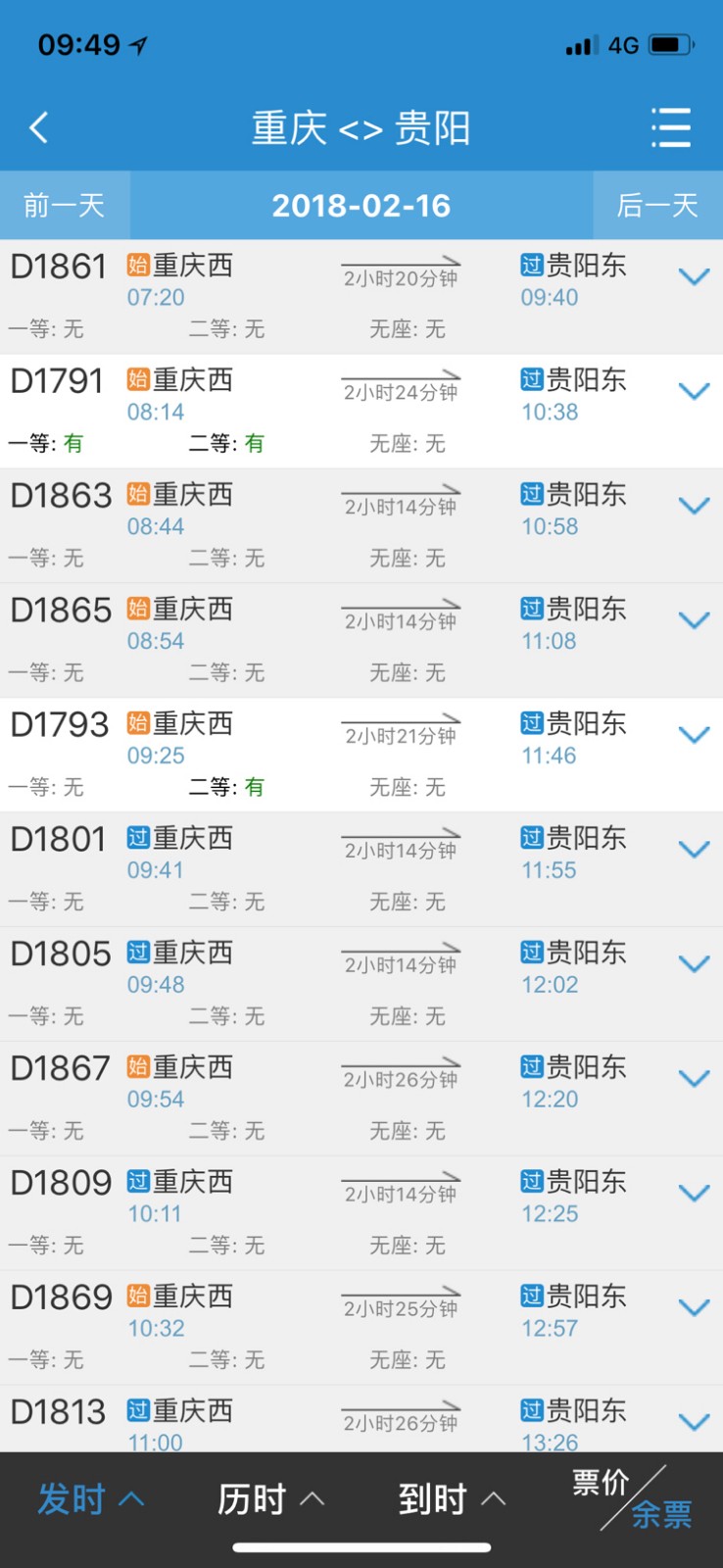 19日9:36,记者查询余票发现,渝贵铁路的火车票售票情况非常火爆,按照预售期30天计算,今天可买到2月16日的火车票,除了D1791、D1973次还有极少数的车票外,2月16日之前的火车票几乎全部售罄。火车站提醒:计划乘坐渝贵高铁的旅客一定要计算好预售期,及时抢票,以免耽误自己说行程。