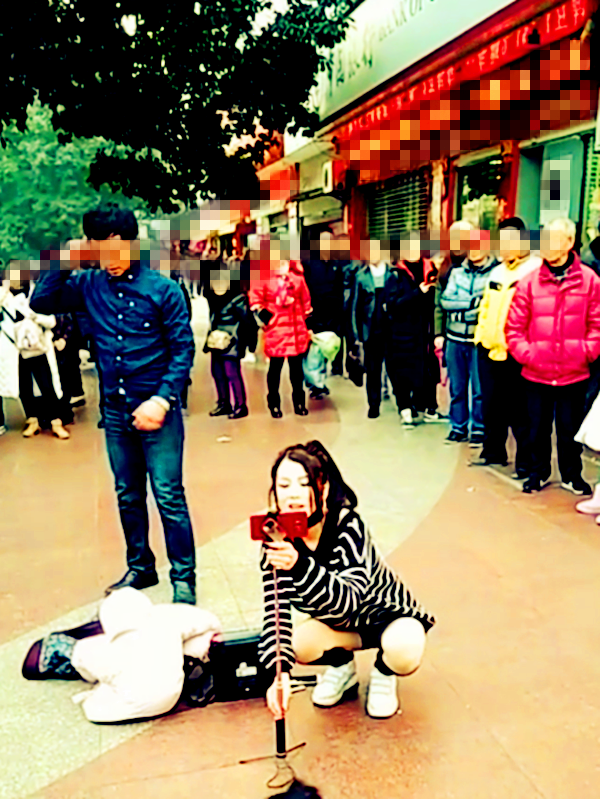 引来不少市民围观,很多市民殾围出了一个圈,将妹子与男子一起围在了圈内,大家都穿着棉袄长裤,还将手揣在棉衣里面躲避着寒冷。