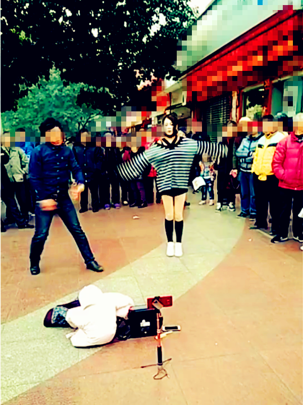 妹子一袭夏装直播舞姿 市民穿厚衣长裤围观