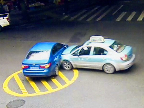 2018年1月16日,在重庆长寿骑鞍街兴学园路口,一辆蓝色私家车和一辆出租车发生碰撞,双双停在了十字路口的中央。
