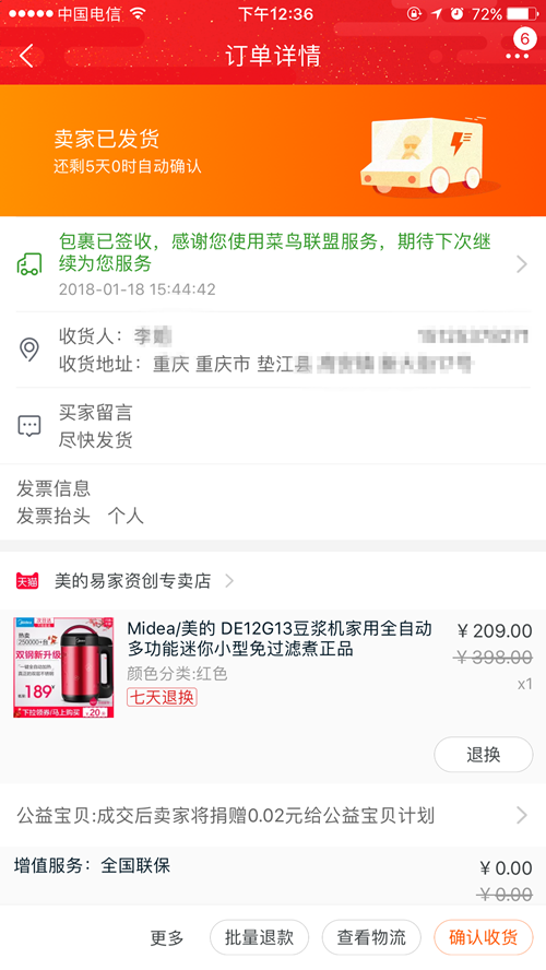徐女士介绍,由于马上就要过年了,自己想给老家的爷爷奶奶买点新年礼物,孝敬一下老人。前几天,刚发了工资,于是就在网上购买了一件冬装和一台豆浆机,寄回老家。