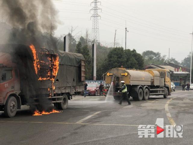 货车想过收费站 突然起火“仙气飘飘”