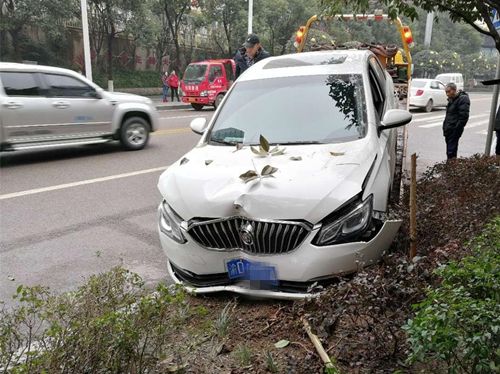 轿车冲上绿化带 车头变“中分”