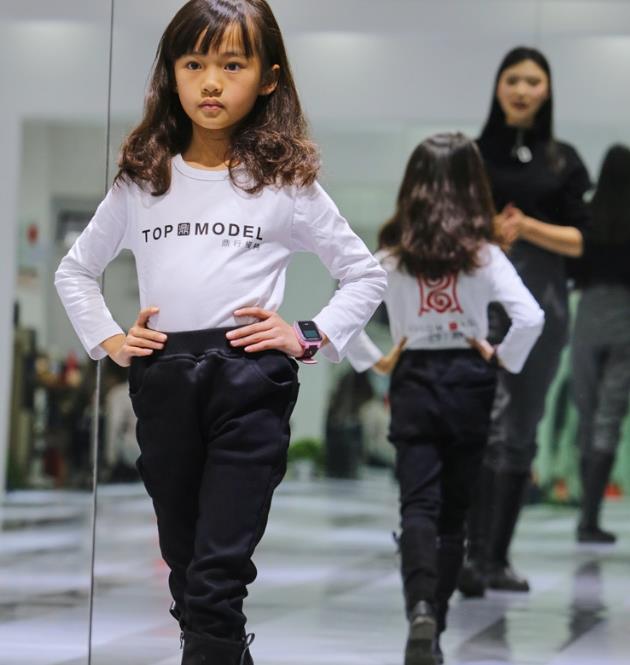 22日,在重庆鼎行模特公司排练室,罗凯诗穿着白色T恤和高筒靴,跟随着一旁的模特一起走“猫步”。今年8岁的她,在一群超过一米七的大高个儿中显得格外娇小可爱。