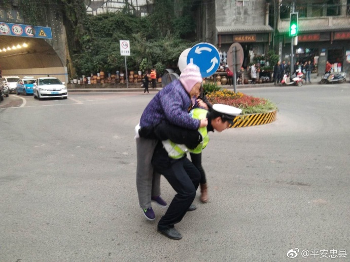 1月17日,正在忠县中博隧道转盘处定点执勤的忠县公安局交巡警张倩看到,一位老人站在转盘三分之一处,几次想穿过马路,但都被车流挡了回来。老人颤颤巍巍的站在路边,随时有被车辆撞到的可能。