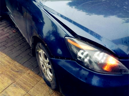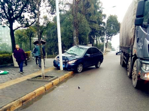 有目击者称,当时由于小轿车转弯速度过快,为了躲避一辆直向行驶的大货车而猛打方向,一时失控,所以才驶上路沿撞上路灯杆的。所幸,没有人员受伤。