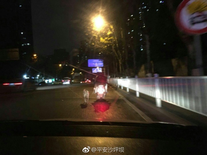 来自平安沙坪坝官微的消息:1月26日19时许,沙区110民警在站西路巡逻时意外发现奇葩一幕,一小伙骑着摩托车,偶尔歪着脑袋瞧下左边奔跑的狗狗,仔细一看小伙手里还拽着狗绳,很显然他在马路上遛狗 。