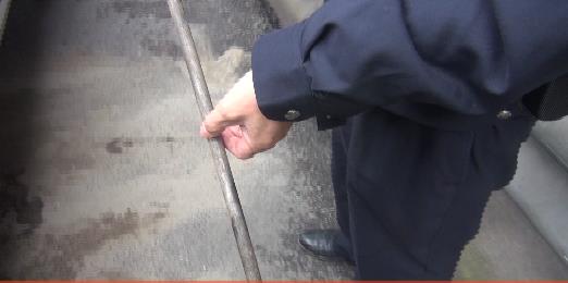 到达现场后,中队官兵发现漏油车辆已被挪至加油站外,漏油原因则为汽车油管被插入一根约长60cm的钢管。