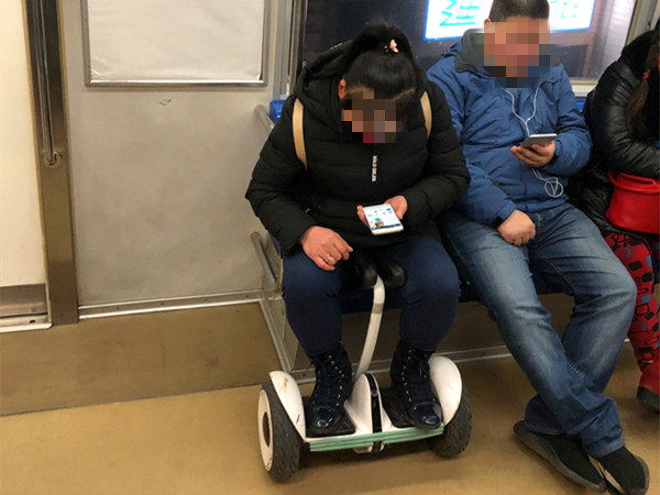 女子车厢内踩“风火轮” 专注玩手机