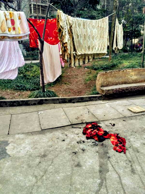 发布时间:2018-02-01 16:34:362018年1月31日下午,重庆永川有网友爆料说,自己小区里有孩童玩鞭炮,不小心把火引燃了小区其他业主正晾晒在户外的被套。