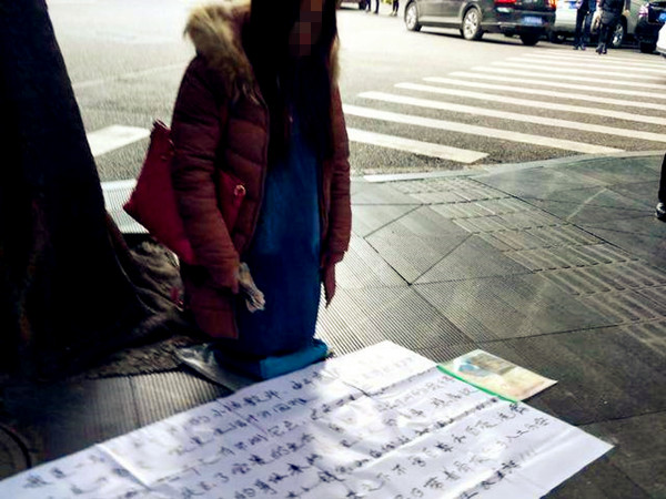 寒冷的冬天,女子就这样跪在地上,让人看着着实心疼。