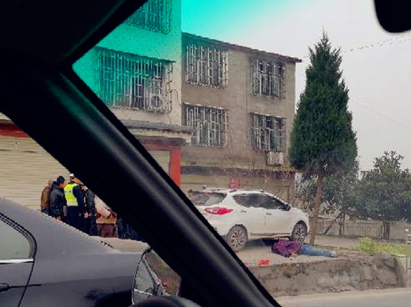 有现场目击者称,当时也不知怎么的,一辆白色轿车开进公路旁边的地坝上,将两人撞倒。