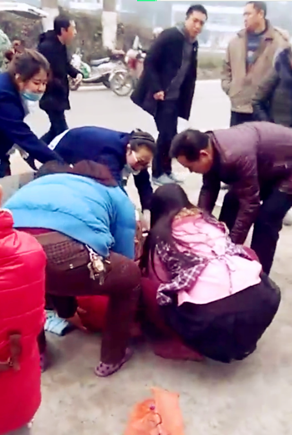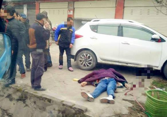 其中一位伤者被大家合力抬上担架,另一位则倒在地上,身上盖着一件紫色的棉袄,一动不动,身旁还有一个竹背篓,鲜红的血流出好几米,看得人十分揪心。