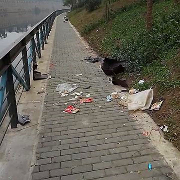 2018年2月7日,璧山区青杠实验小学附近的沿河步道上,好几百米沿河路段之间的垃圾桶遭遇劫难,全部被恶意破坏掉,遍体鳞伤,垃圾桶里面的垃圾散落出来,一片狼藉。