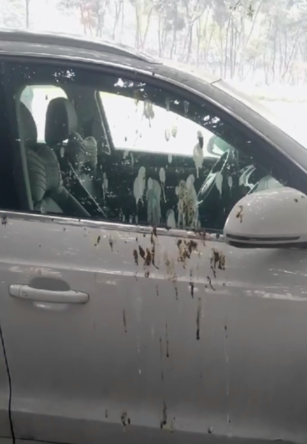可走近一看,整个车顶、车窗上全是稀稀疏疏的鸟屎,简直是被包围了,黑的白的重叠在一起。