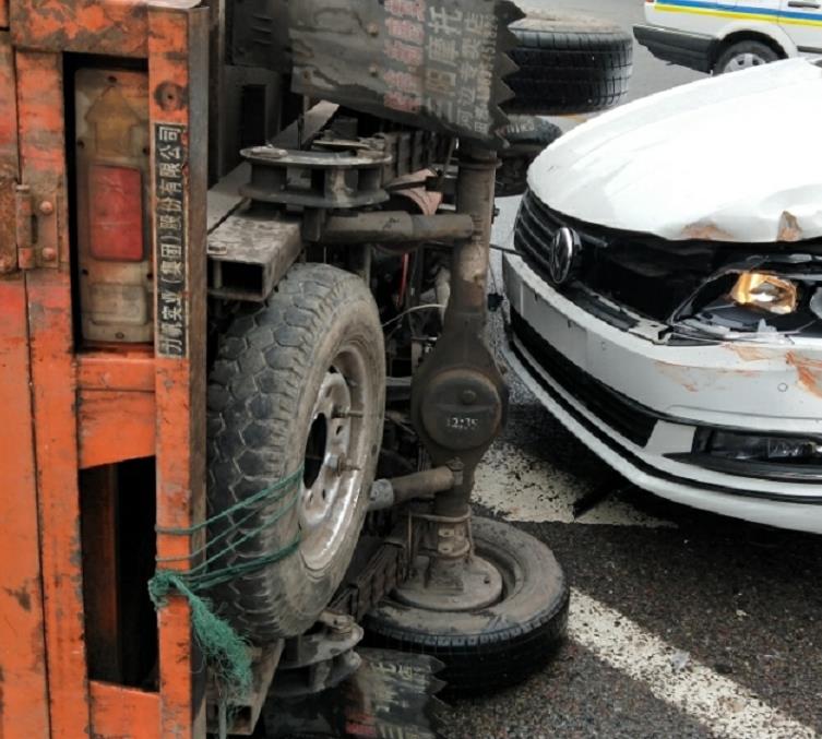 侧翻在地的三轮和白色小轿车,停在道路中间,周围站了不少围观市民。大家议论纷纷,有现场目击者介绍,当时两车均为同向行驶,轿车突然减速,在后面行驶的三轮准备从轿车左侧超车,谁知轿车司机没有注意到正在超车的三轮,方向盘往左一个掉头,结果将三轮车当场顶翻在地,由于惯性左右,两车滑行一段距离后,最终在对向车道上才停了下来。
