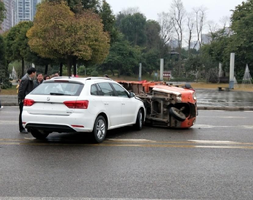 未上牌新车与三轮相撞 三轮车侧翻倒地