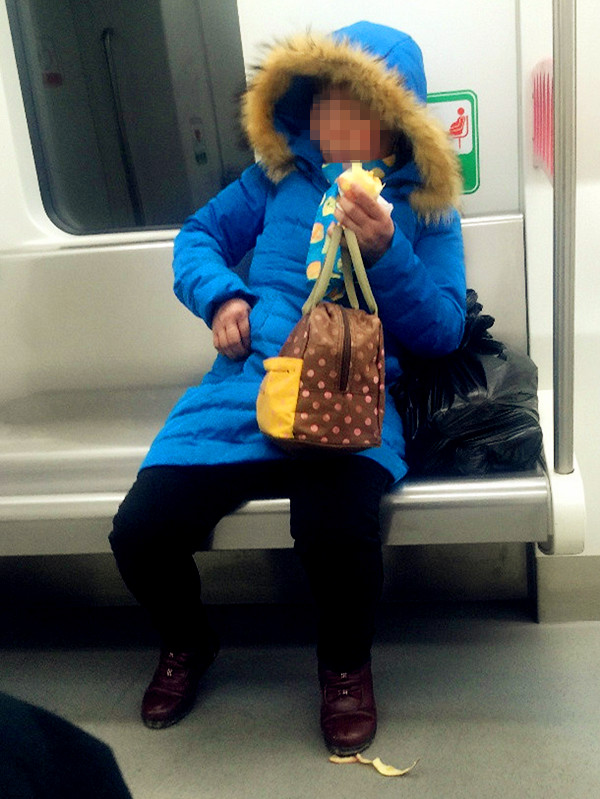 2018年2月14日一早,有市民乘坐轨道交通6号线出行,在车厢里看到一名女子一边削苹果皮一边吃苹果。
