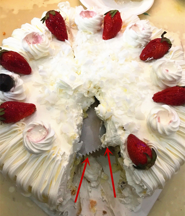 网友说,生日当晚8点半左右,自己花了248元购买了一个马卡龙乳脂蛋糕。一眼看上去十分诱人,白嫩奶油上还点缀着鲜红的草莓。令人看着就忍不住赶紧切开全部吃掉,在切蛋糕时,蛋糕刀突然被卡住怎么切都切不开。待网友扒开仔细一看才发现,在奶油下面竟然包裹着一块带锋利齿状的硬物,就像是一片”电锯刀片“。