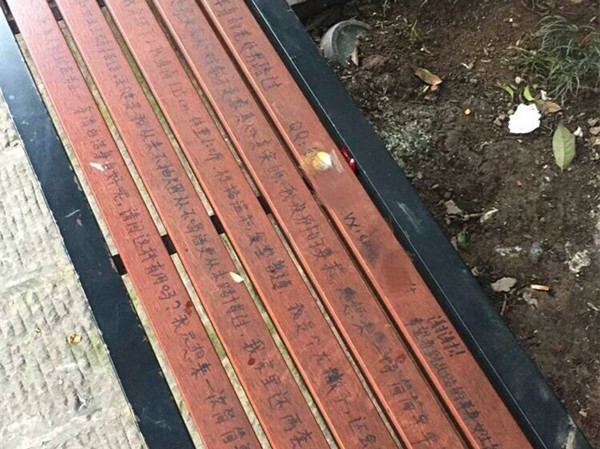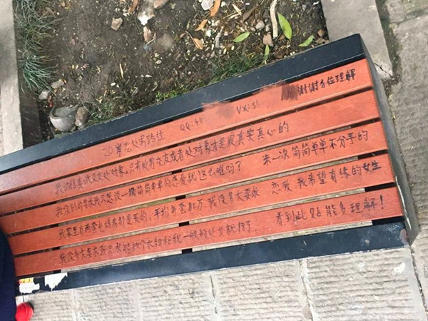 这几张公共长椅由五根扁平的木板,加上金属架子搭建而成,在被打磨光滑的木板表面上,有用黑色记号笔写着:“20岁老处男,诚信真诚交友处对象,不抽烟、不喝酒,会炒菜煮饭,有两套电梯房,平均每套80万,想谈一场简简单单永不分手的恋爱”。