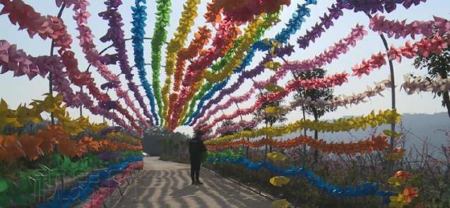 在万州区甘宁镇其芳花谷,一进大门,成千上万个小风车扎成的风车隧道五彩斑斓。风车在和煦的春风吹拂下齐刷刷地快速转动,园区很多道路都是这种风车隧道,不仅如此,地里也有无数的小风车在转,远远看去,像招展的花朵。还有用花伞扎成的隧道,五颜六色,市民徜徉其间,感觉赏心悦目。