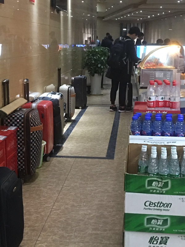 一排排五颜六色、形状各异的行李箱,在网吧大门口排起了长龙,十分壮观。